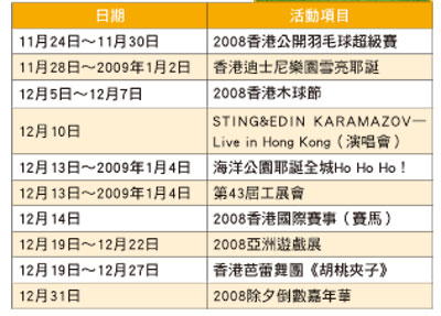 每逢冬季香港旅遊發展局總是集結當地景區、商城、慶典、活動等包裝出獨具巧思的內容,熱鬧繁華的香港搖身變成繽紛動人而且浪漫溫馨的旅遊、度假、購物天堂。特別對於台灣旅客而言,今年香港繽紛冬日節將於在11╱28展開,延續38天至2009╱1╱4結束,屆時,香港全城瀰漫濃厚聖誕節喜氣洋洋的氣氛。