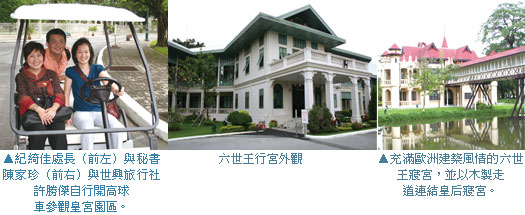 目前台灣旅行團較常安排參觀近曼谷市中心的五世王行宮,此行泰觀局安排參訪自曼谷向西行往佛統方向約60公里的泰國六世王行宮,體驗不一樣的異國風的皇宮建築,要注意的是入內參觀需脫鞋且不可拍照,皇宮內每一個房間或空間都擺設自不同國家訂做的傢俱,得以帶領旅客想像從前六世王豪華的生活品質。