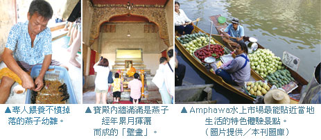 位於曼谷西南方向約90公里處的Amphawa周末黃昏水上市場,與國外觀光客印象中的水上人家、水上市場(歐式水上市場)不同,為近年來泰國政府為教育年輕民眾了解國家傳統文化所特別促成的景點,目前已成為泰國當地民眾週末的熱門去處,也很適合推薦台灣自由行旅客前往探奇。