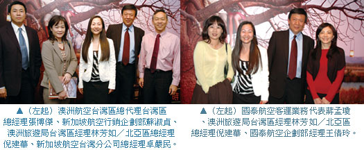 ▲ (左起)中華航空台北分公司行銷策劃部經理郝光復╱客運營業部團體組主任羅俊英╱客運營業部歐洲線主任魏怡卿、澳洲旅遊局台灣區經理林芳如、澳洲昆士蘭旅遊局台灣區行銷經理簡明芬、長榮航空客運本部營業部商務課課長梁文龍╱營業課曹慧菁。