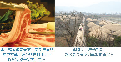 朱東植強調,2007年11月務安國際機場正式啟用,加上2012年麗水世界博覽會也將在全羅南道登場,顯示全羅南道的旅遊將受矚目,雖然目前台灣前往全羅南道並沒有直航班機,業者仍可運用仁川機場或釜山機場進出,可運用巴士或KTX等交通工具只需2~3小時,就可抵達全羅南道各景點。仁華觀光代表理事孫繩溥則建議,業者可搭配從濟州航點進出,再搭高速客輪也可到達。在產品方面,仁川機場進出「全羅南道內藏山.愛寶.溫泉水世界5日」、釜山機場進出「韓國摩西奇蹟5日遊」,以及濟州機場進出「濟州+全羅南道5日遊」,希望透過各地豐富景點和美食,讓台灣旅客深切感受全羅南道之美。