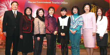 (左起)澳門旅遊局台灣代表處行銷經理林鴻祥、旅遊局市場處處長霍慧蘭、旅遊局公關處處長容美華、旅遊局副局長文綺華、旅遊局推廣廳廳長謝慶茜、旅遊局宣傳暨製作處處長馬麗絲、台灣代表處代表梁吳蓓琳、台灣代表處行銷副理歐綉瑜。