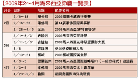 2009年馬來西亞各地均推出各式慶典活動,種類豐富、精采有趣,馬來西亞觀光局台北辦事處處長拿希亞指出,「熱情歡迎大家恣遊大馬風光,享受比你想像多更多的旅遊體驗,且台灣直飛馬來西亞僅需3個半小時,沒有時差,當地華人眾多,語言相通,歡迎台灣旅客到訪。2009年馬來西亞觀光局特別推出五大精選節慶主題,不論團體旅遊、輕鬆自由行、商務觀光等,絕對滿足各種旅遊需求。」 五大精選節慶主題包含舒暢樂活遊(柔佛國際風箏節、馬來西亞花神祭、馬來西亞水上嘉年華、砂勞越世界熱帶雨林音樂節)、極限吶喊行(馬來西亞國油雙峰塔FI巡迴賽、納閩島國際海洋挑戰賽、雨林漆彈嘉年華)、瘋狂血拼購(馬來西亞GP特賣會、馬來西亞購物嘉年華、馬來西亞特賣會)、品味美食團(檳城國際美食節、吉隆坡及沙巴、砂勞越美食節)、大馬原味賞(印度教大寶森節、衛賽節、開齋節及屠妖節)等,旅客可融入各式各樣的慶典活動,盡享馬來西亞獨有風情。