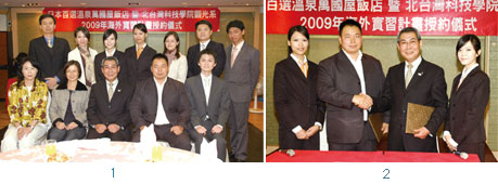 2. 北台灣科技學院觀光系主任陳寅全(左2)與萬國屋營業部部長齋藤久雄(右2)正式交換培訓計畫簽約書。