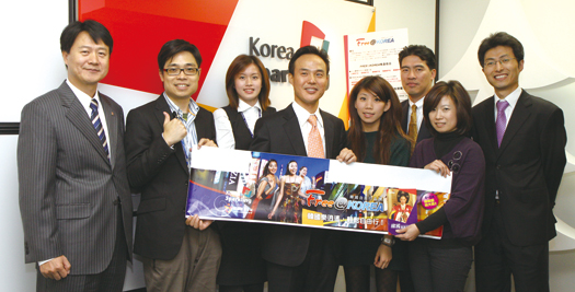 ▲ (左起)韓國觀光公社台北支社次長李長儀、燦星旅遊網旅行社東北亞產品主任瞿光復、山富旅行社經理陳婉如、韓國觀光公社台北支社長韓和埈B喜鴻旅行社東北亞自由行線控副主任林靖純、喜麟旅行社副總經理鄭國麟、鳳凰旅行社亞大部經理方彩雲、韓國觀光公社課長朴範錫。