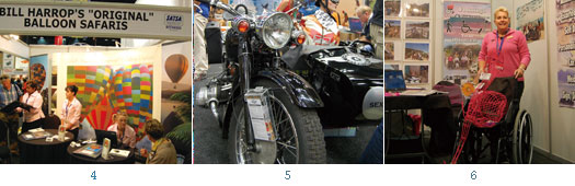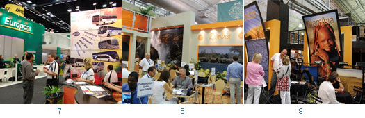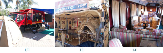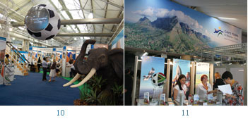 4.「Bill Harrop’S Balloon Safaris」在西北省與豪登省、凌波波省都有進行高空熱氣球Safari的場地。5.觀光遊歷不一定搭遊覽車,坐上豪邁的打擋車車廂也頗有一番滋味。6. Flaming Tours專為身心障礙的遊客規畫旅程。7.租車業者與買家熱切洽談。8.贊比亞主題館。9.那米比亞主題館。10.西北省以足球賽為主題館的設計風格。11.開普敦攤位以桌山景區為主題。