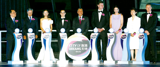 ▲ 澳門新濠天地開幕儀式貴賓雲集,(左起)澳門特區經濟財政司司長譚伯源、中國外交部駐澳門特區特派員公署特派員盧樹民、新濠博亞娛樂聯席主席及行政總裁何猷龍伉儷、澳門特區行政長官何厚鏵、新濠博亞娛樂聯席主席James Packer伉儷、中國中央人民政府駐澳門特區聯絡辦公室副主任高燕以及新濠天地總裁賀堃。