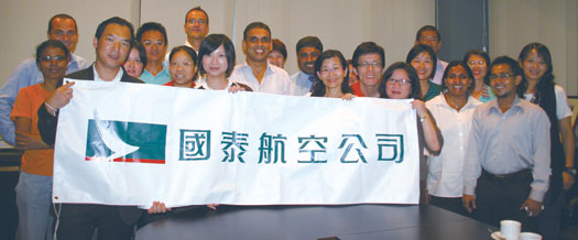 ▲國泰航空斯里卡考察團於考察期間拜訪愛斯旅遊公司,由愛斯旅遊業務總監納林(布條「航」字後方者)等人盛情接待,同時並開會共同討論斯里蘭卡旅遊安排相關事宜。