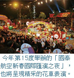 在繽紛的賀歲活動中,連續第15年舉辦的農曆新年巡遊匯演已經成為一項國際矚目的盛事。今年同樣由港旅局主辦、國泰航空贊助,在2╱14大年初一所舉辦的「國泰航空新春國際匯演之夜」,則將較以往更增添獨特的國際色彩,花車隊伍將於晚間8點從九龍尖沙咀香港文化中心廣場出發,沿著尖沙咀主要街道前進,一路呈獻精采的活動演出以及互動遊戲帶動氣氛。