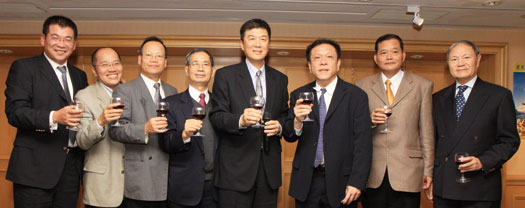 (左起)台灣仁本集團執行長陳川源、新進旅行社總經理方世宗、上順旅行社董事長李南山、良友旅行社董事長陳政男、麗星郵輪台灣總經理盧冠群、永業旅行社董事長吳勛豐、大登旅行社董事長林博宗、威爾森通運董事長周家獻。