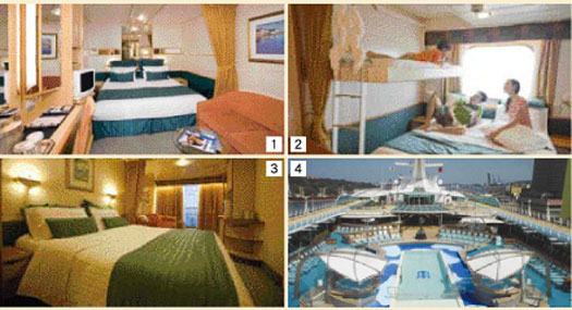 1.海洋神話號的內艙艙房,配置兩張單人床(可合併為大號雙人床),擁有獨自的淋浴衛浴設備,沙發休息空間與電視、電話和收音機等。(圖片提供>皇家加勒比海國際遊輪)