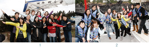 2.業者們用另一種交通工具體驗濟州好玩之奧妙,圖為搭乘遊艇欣賞獨特奇景∼柱狀節理景色。(後站排左起)狀元國際旅行社總經理陳文里、燦星旅遊網旅行社東北亞韓國線經理瞿光復、新泰昌旅行社台北支社長謝雅芬、復興航空營運處客運營業部業務經理陳泓達、康福旅行社產品部韓帛線協理萬麗香、韓國濟州特別自治道政府駐台觀光推廣辦事處處長慕馨、東南旅行社東南亞部副理姜秋月、仁華觀光劉婷菀、京城天下旅行社陳佩芳、復興航空行銷規劃室資深業務李育修;(前排左起)明旅行社海外部部長林守盛、雄獅旅行社東北亞部吳孟芳。