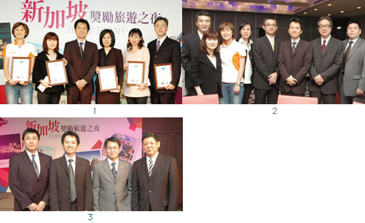 1.新加坡旅遊局台灣辦事處處長黃元敬(左)頒發2010╱2011年新加坡商務旅遊專家授證予業者代表,(左起)百威旅行社團體部經理俞示芬、東南旅行社馬新線課長黃湘雲、康福旅行社專案部副理林品瑩、大登旅行社票務部經理陳姿瑾、雄獅旅行社企業服務部協理周化宇。2.(左起)華航台北分公司客運營業部馬新檳菲線主任黃順安、東南旅行社馬新線課長黃湘雲、百威旅行社團體部經理俞示芬、華航台北分公司直課推廣部主任許丕蒂╱經理邱彰信、新加坡旅遊局台灣辦事處處長黃元敬、華航台北分公司客運營業部副理呂虤╱直課推廣部業務副主任陳宣宇。3.(左起)澳洲航空台灣區總經理張博傑、新加坡旅遊局台灣辦事處處長黃元敬、長榮航空客運本部營業部商務課周春福、新加坡航空台灣分公司業務經理雍景岡。