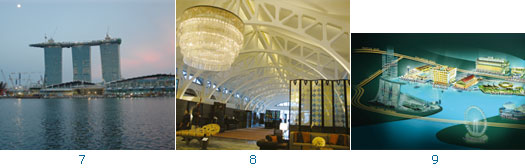 規劃4╱27開幕的「濱海灣金沙」正緊鑼密鼓趕工中,在對岸One Fullerton眺望,猶如「川」字型的3座55層樓飯店頂著長達340公尺的空中花園,造型獨特十分壯觀,其佔地15.5公頃,總投資52.5億新元(約折合1207.5億新台幣),第一階段對外開放區域包括:963間飯店客房、部分購物商場、會展設施、名廚餐廳與其他餐飲店,以及娛樂場,據聞會展中心檔期排到2015年,相當熱門。