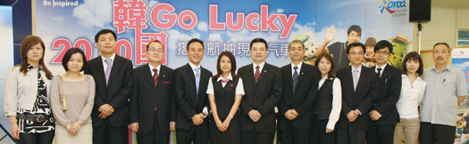 ▲韓國觀光公社台北支社長韓和埈(左5)、華航台北分公司行銷策劃部經理陳乾儀(左7)╱客運營業部副理羅俊英(右4),以及華航韓國線6大主力業者。