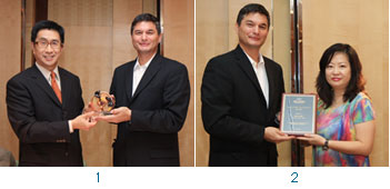 1.達美航空總經理張建仁(左)代表美國旅遊推展協會頒發感謝獎牌給美國在台協會商務組長黃德昌。