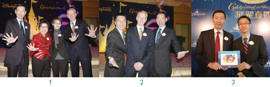 ▲(左起)香港特別行政區旅遊事務專員容偉雄、華特迪士尼樂園度假區亞洲區總裁及行政總裁安明智、香港特別行政區行政長官曾蔭權與香港迪士尼樂園度假區行政總裁金民豪,共同主持五週年慶典啟動儀式。(圖片提供>香港迪士尼樂園度假區)