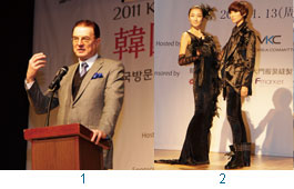 1.韓國觀光公社總社社長李參。2.在韓國時尚旅遊之夜的晚宴上,韓公社特別邀請到模特兒為韓國設計師品牌走秀,展現當地平價設計品牌的超強實力。