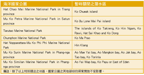 為防止珊瑚礁白化現象惡化,以及加速恢復受影響之珊瑚生態地區,因此國家公園暨野生動植物保護組織(The National Park, Wildlife and Plant Conservation Department-DNP)於日前宣佈,泰國境內位於安達曼海及暹邏灣的7座海洋國家公園,其受影響之珊瑚礁白化現象超過80%的地區將暫時關閉,包括以下地區: