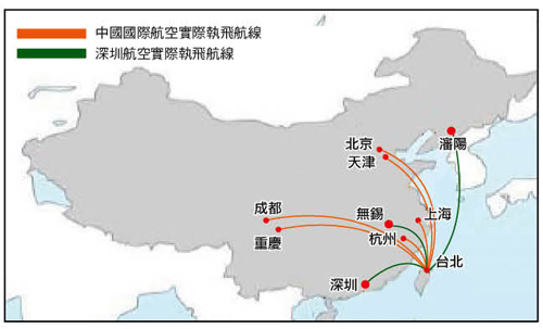 兩岸航線自2008年7月周末包機啟動以來,目前已成台灣地區與全球最繁忙的航線之一。國航自兩岸航線開航以來已是商務客的搭乘首選,國航與其控股公司深圳航空,在兩岸航線上提供最密網絡、最優線路、最新飛機、最快訂位,以涵蓋200 條大陸內陸航線,13條地區航線及69條國際航線,含代碼共享航班每週往返兩岸共 186班,平均機齡不到8年,而且是目前大陸航空公司中,唯一在台灣提供網路訂位的航空公司。