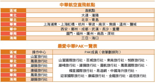 「最愛中華」品牌,為了改善市場上大陸旅遊產品市場的混亂而誕生,以華航豐富的航點,在6大區塊完整佈局,強調全程無購物、無自費,高檔餐食加上星級住宿。針對冬季規劃出10多項旅遊產品,提供消費者冬遊神州的絕佳選擇。在11月,最愛中華PAK業者也從13家增長至15家,新增了兩家位於台中的生力軍,使得PAK 業者銷售力度更加全面。