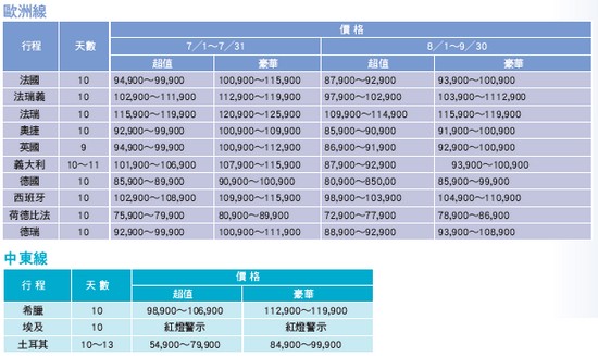 歐洲因為匯率上升的影響,團體旅客並沒有在暑假湧現,尤其在西歐的部分,市場較趨於飽和。但是東歐表現不俗,奧捷產品在市場上已經熱銷近3年,現在在維也納的機位取得依舊搶手,堪稱歐洲產品的黑馬。另外,位於巴爾幹半島的克羅埃西亞、斯洛維尼亞產品,在年初被業者投以高度期待,不過目前業者對此路線的成績大多認為不如預期,且克斯的日韓旅客眾多,對於台灣業者掌握房間較不容易。