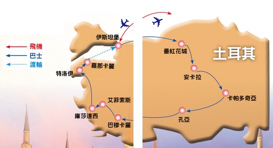 在點心旅遊的精心規劃下,旅客將輕鬆暢遊聯合國教科文組織評選為「人類文化遺產城市」的番紅花城、世界自然文化雙遺產的棉堡、世界7大奇蹟之一的艾菲索斯古城遺址, 以及聖索菲亞大教堂與藍色清真寺等必遊亮點。不僅在遊程內容嚴謹規劃, 在住宿選擇上亦相當講究, 特地安排伊斯坦堡獨家住宿3晚5星,深入體驗新舊城區,並且帶領旅客搭乘老式電車穿越伊斯坦堡巷弄街景。