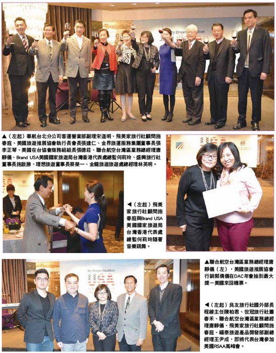 ▲(前排左起)美國旅遊推展協會副會長朱光志、會長張建仁、IPW國際諮詢委員會﹙台灣﹚主席唐靜儀、副會長蔡榮一、(後排左起)公關李南山、鳳凰旅遊長程部副總經理邵鼎清、美國旅遊推展協會行銷郭倩儀、飛美家旅行社顧問施春庭、美國旅遊推展協會財務長顏銀德。