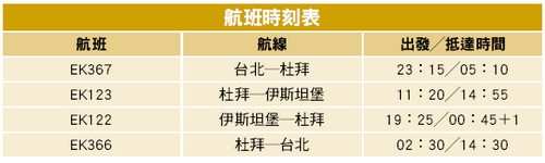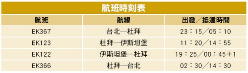 阿聯酋航空台北─杜拜航線,延伸至伊斯坦堡,擁有後段飛行時間最短的優勢。不少業者藉此包裝出土耳其、杜拜同遊的產品,且兩地的旅遊資源具有互補性,旅客一次出遊可欣賞古文明,以及當今全球最現代化的城市景觀。