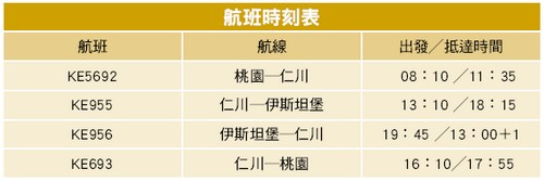大韓航空每週飛航仁川─伊斯坦堡5班,是市場唯一當天抵達伊斯坦堡的航空選擇,旅客無需在機上過夜;而在回程的航班時間,則為晚上7:45,旅客在最後一日還可安排完整觀光時間。近年來,韓劇成功帶動赴韓觀光人潮,大韓航空亦針對想要順遊韓國的旅客,提供不加價服務,旅客只要支付機場稅金約400元,即可順遊首爾,享受摩登城市的旅遊樂趣。此外,大韓航空貼心地在經濟艙也準備有過夜包,且轉機時還提供旅客每人1瓶「濟州礦泉水」,精心設計的容量大小,過安檢也免擔心。