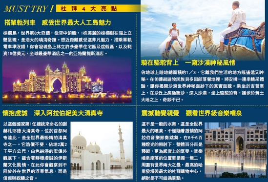 全新A380夢幻巨無霸直 飛杜拜 航程僅8小時40分鐘 省下16小時轉機時間 生命中最華麗的體驗 五感全面啟動 24小時玩不盡 高中低價位行程多元豐富