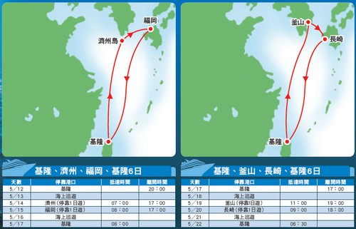 針對5╱12「基隆、濟州、福岡、基隆6 日」、5╱17「基隆、釜山、長崎、基隆6 日」產品,在2╱28前報名並繳交訂金,就可享有減免2,000元的早鳥優惠,另還可免費獲得韓國濟州島+日本福岡、韓國釜山+日本長崎的岸上觀光行程,讓旅遊內容更加全面。