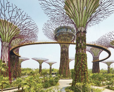 佔地廣達100公頃的花園與巨大的半球型溫室,囊括25萬種珍稀植物,在都會中的綠意盎然令人心曠神怡,多棵巨大的擎天大樹(Supertrees),高達16層樓,可登上鳥瞰整座花園美景,入夜後更能免費觀賞音響燈光秀,璀璨絢麗。