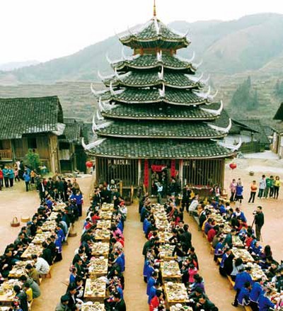 百家宴,亦稱「合攏飯」或「長桌飯」,是侗家集體待客的宴席,是侗族待客的最高禮儀。2008年,三江侗族百家宴被列入廣西壯族自治區非物質文化遺產保護項目。當有重要客人或大量客人來訪時,侗族各家各戶將自家的美味佳肴,如酸魚、酸豬肉、酸鴨、酸辣椒、糯米酒、糯米飯等,帶到鼓樓前庭院,展開長凳長桌,將飯菜一碗碗擺放齊整,全寨的男女老少,不分主賓,排坐在一起品嘗侗家美味,讓每位前來的遊客皆大呼過癮。