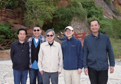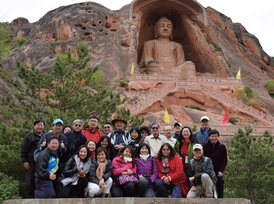 ▲台灣高校教師寧夏絲綢之路參訪團於須彌山石窟景區內大佛前合影。