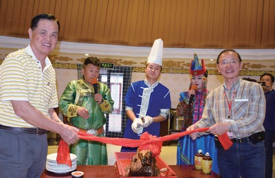 ▲享用烤全羊前的龍種歌舞儀式登場。(前左:中華大學觀光學院院長蘇成田、前右:台灣高校教師寧夏絲綢之路參訪團團長李銘輝。)。