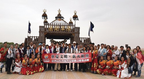▲台灣高校教師寧夏絲綢之路參訪團於通湖草原旅遊區合影。