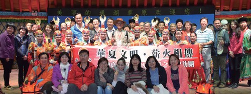 ▲台灣高校教師寧夏絲綢之路參訪團與通湖草原傑出的表演者合影。