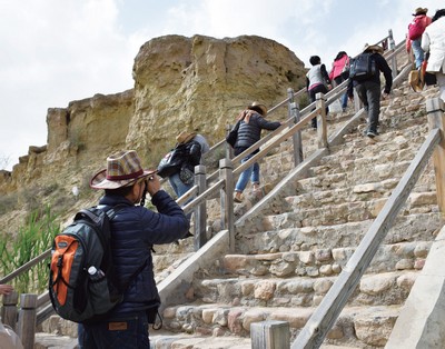 ▲台灣高校教師寧夏絲綢之路參訪團對於須彌山石窟景區充滿好奇。