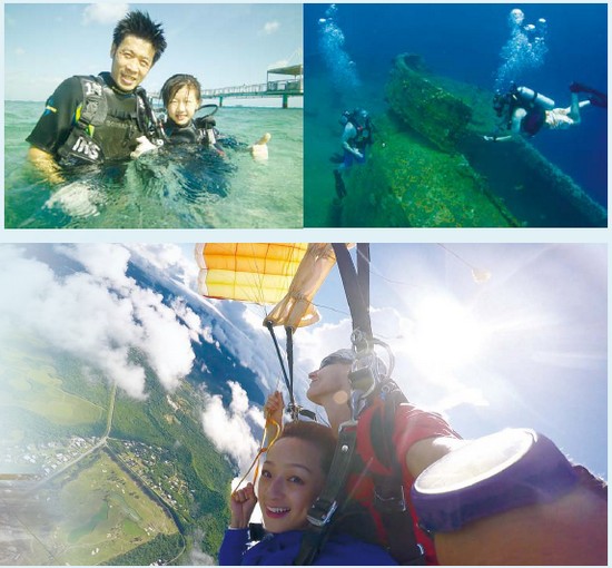 關島與馬里亞納海溝相近,有全美面積最大且種類最多的珊瑚礁區,加上遺留著第一、第二次世界大戰的船艦遺骸,無疑是潛水客的天堂。當地有2家提供中文解說的潛水業者分別是JNS及小康潛水。只要10歲以上就能體驗徜徉海中,和海龜共遊的樂趣!如果不能潛水也沒關係,滿4歲的小朋友就可以跟著教練一起開小飛機,一覽整個關島迷人的景致SKY GUAM AVIATION。膽子要是夠大,當然更不能錯過當鳥人的機會—空中跳傘SKYDIVE GUAM,從天空俯瞰整座島嶼,綿延的海岸線美到讓人完全忘了害怕!不想這麼刺激,就漫步在白色的沙灘,聽著浪花拍打的聲音、椰風搖曳,心情頓時放鬆不少!