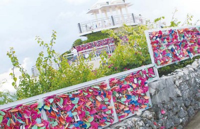 傳說中有一對查莫洛的戀人,因為雙方家長的反對而選擇在這裡將兩人的髮束捆綁在一起,雙雙跳崖殉情,此後便化做戀人岬兩邊的海岸線長相思守。故事淒美動人,吸引了各地的情侶來此朝聖,希望能藉此得以天長地久!此外,從戀人岬可以一覽菲律賓海及杜夢灣的美景。從瞭望檯向下看,真的可以看見兩邊的岩石,一邊宛如少女的側臉,另一邊則像是男子的側臉,讓故事更加栩栩如生。