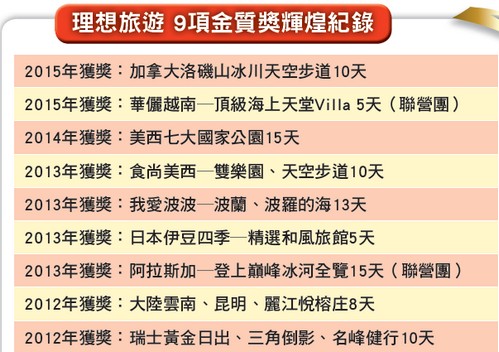本屆金質獎當中,理想旅遊以「加拿大洛磯山冰川天空步道10日(雙飛雙鑽+5晚城堡+精靈島)」拔得美洲旅遊頭籌,產品最大特色便是「雙飛、5堡、2 鑽」:溫哥華飛愛德蒙頓及卡加利飛維多利亞,省卻長途跋涉的拉車時間,將精華時段留給旅客欣賞最美麗的洛磯山脈;入住5晚費爾蒙集團連鎖城堡飯店,不但在國家公園內停留2晚,更可盡覽「百萬之窗」的名品絕美景致;溫哥華則全台首創安排香格里拉正市區鑽級酒店,班夫規劃入住岩之緣金鑽級豪華酒店,帶給旅客最舒適尊榮的住宿體驗。