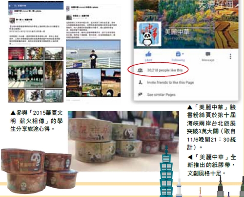 於海峽兩岸台北旅展期間,「美麗中華」亦安排有展場特派員,隨時分享B 區大會舞台的精采活動,同時針對「2015華夏文明 薪火相傳」的學生心得分享進行發文,讓大家透過學子的心與眼,一同感受陸遊的樂趣。