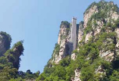 用世界最快觀光電梯賞曠世山景百龍觀光電梯可謂世界上獨一無二的建築。由於張 家界山區面積遼闊,許多地方皆保有原始景觀,如果 想站在高處俯瞰群峰怪石,過去只能靠步行翻山越嶺 才能一賞曠世山林,現在想觀賞自然遺產張家界,只 需搭乘這部世界上最高最快的觀光電梯,花不到2分 鐘就能一步登頂,欣賞以石英砂岩形成的峰林奇觀。