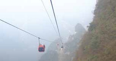 搭乘最長最高纜車入天門山之魂長7,454公尺,高度落差1,277公尺的天門山纜車, 是目前世界上最長的單線循環式高山索道。從市區出 發,會先看到張家界市區的模樣,向上的過程中,會 行經天然湖泊,99彎通天大道,還可眺望以喀斯特 岩地形著稱的天門山相貌,臨空獨尊的非凡氣勢,在 約半小時的視覺震撼後,終點即達天門山山頂,壯麗 恢弘。