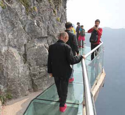 在峭壁上試膽行走天空玻璃步道懸於天門山山頂西線,並驚險懸於峭壁之外的鬼谷 棧道,長60公尺,位於海拔1,000多公尺之處。以玻 璃打造的眺望台,行走於上方讓人感到驚險刺激,手 心冒汗,從玻璃台低頭俯視,還能看見下方的懸崖深 谷,是來到天門山的必訪試膽景點,心臟大顆的人可 先在入口處穿好鞋套,在天空玻璃步道上感受腳踏懸 空之妙感。