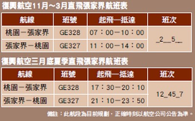 搭配復興航空從桃園直飛張家界荷花機 場,全程不到3個小時,在假期中省去舟車 勞頓的辛苦。高品質的旅遊安排,讓每個愛 好山林、重視住宿環境及航行時間的旅客, 都能在假期的安排上,更加彈性,也更豐富 更多元。絕美景點+高端食宿+高效交通, 一向是旅行中最不可或缺的3大要素,復興 航空直飛張家界的行程,將使業者與消費者 間,趨向完美平衡,讓高規格、高CP值的旅 遊體驗,在國內展現更多的可能。