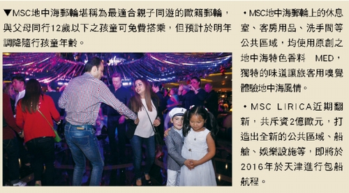 MSC地中海郵輪上海有限公司香港&台灣銷售經理張皓 雯表示,MSC以「MSC cruises Mediterranean way of life」為 口號,致力於船上提供地中海式生活體驗。MSC深耕於歐 美等航程經營,目前12艘郵輪分布狀況約東地中海3艘、 西地中海4艘、北歐3艘、加勒比海1艘、杜拜1艘,而明年將由MSC LIRICA首度以天津為母港,進行包船航程。