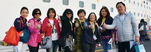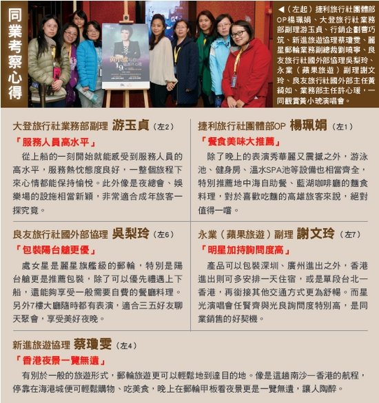 此次麗星郵輪特別於1/8帶領銷售夥伴:大登 旅行社、永業(蘋果旅遊)、良友旅行社、新進旅 遊、捷利旅行社,在3天2夜的行程內一同體驗海上 演唱會的獨特魅力,考察同業在整趟過程中收獲滿 滿,也賦予商品高度評價。