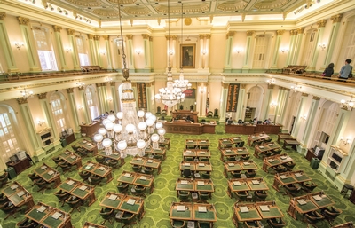 走入州議會大樓,映入眼簾的是40公尺高的圓形屋頂,重現20世紀初的華麗風采,而圓頂下的義大利雕像,分別是哥倫布、西班牙伊莎貝拉女王、侍童,展現古代希臘羅馬風情。為了呈現19世紀末的風貌,參眾兩廳會議廳採用新舊混合的風格,紅綠主題色承襲了英國上下議院的色彩,搭配核桃木書桌、大吊燈、雕花天花板,滿滿的歐式氛圍。值得關注的是,眾議院設掛有林肯總統畫像、設計電子投票系統,呼應了的林肯的格言「議員的責任是制定公正的法律」,讓人感受民主自由的可貴。
